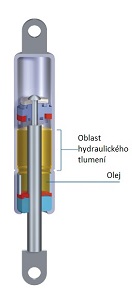 Princip funkce je ve větším objemu olejové náplně. Olejová náplň v blízkosti koncové polohy začne protékat skrz otvor v pístu místo plynu a vlivem rozdílné viskozity oleje proti plynu dojde k utlumení pohybu. Viskozita oleje a tvar přepouštěcího otvoru udává velikost tlumení, množství oleje pak dráhu tlumení. V koncových polohách pak nehrozí přetížení úchytů pružiny dynamickým rázem od skokového zastavení mechanismu.